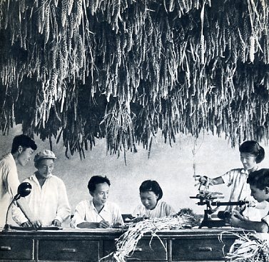 1963年新乡农业科学研究所又做了一批新谷子品种杂交组合,这是研究人员把刚收获的谷子育种材料进行室内考种工作。
