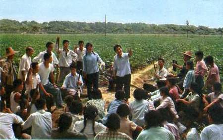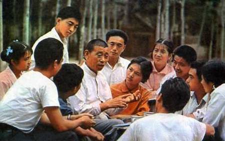 演员们虚心接受贫下中农的再教育。这是他们请老贫农介绍农村两个阶级、两条路线斗争情况。
