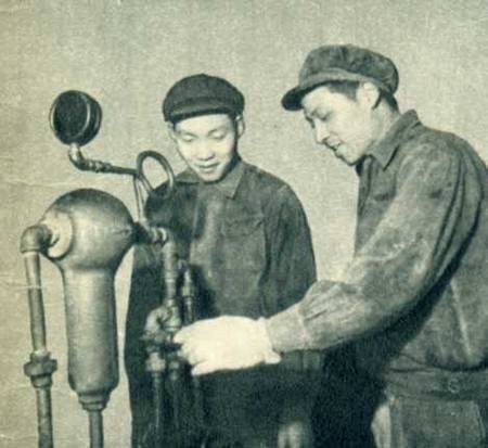 从上海调来的技工陈官福(右)正在教徒工操纵自动化比配碱量的机器。