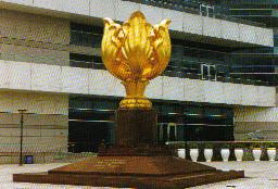 “永远盛开的紫荆花”雕塑。矗立在香港会议展览中心旁。
