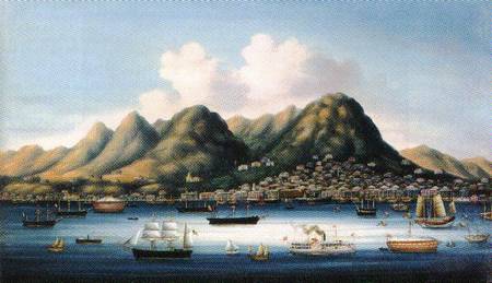 油画《维多利亚城远眺》传啉呱(即关乔昌,详见《中国美术家》中有关条目)绘 1854年 香港艺术馆藏。