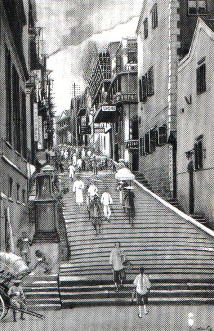 香港著名的古董市场—嚤啰街就在一上楼梯靠右的小街。