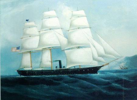 在暴风雨中,远处的船只都几乎翻侧了,而 Ossipee 号仍稳稳地锚定在香港海面上。Ossipee 号1861年在新罕布什尔州朴利茅斯海军船厂建成。1862年服役,在南北战争中发挥了积极作用。其后在太平洋沿墨西哥至中美洲沿岸巡航。1884年,Ossipee 号远航远东,作为美国在亚洲的一个军事堡垒,直至1887年2月15日才返回纽约。该舰于1891年售出。