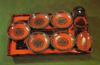 云纹漆案及杯盘—案长60.2厘米,一号墓出土。