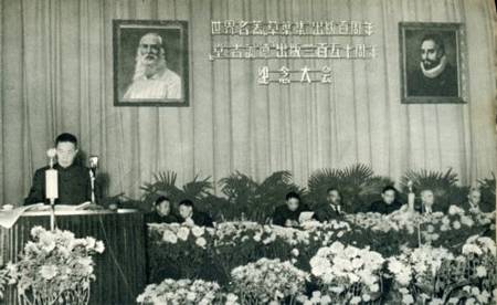 中国人民保卫世界和平委员会、中国文学艺术界联合会等四团体联合主办的世界名著《草药集》出版100周年,《堂•吉诃德》出版350周年纪念大会,1955年11月25日在北京举行。图为中国文学艺术界联合会副主席周扬在会上讲话。