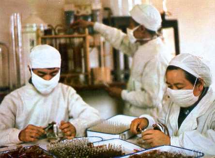 公社卫生院医务人员用中草药制造治疗风湿病的注射液。
