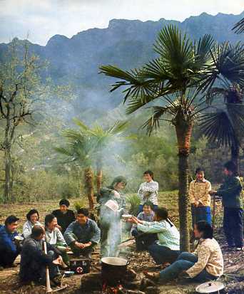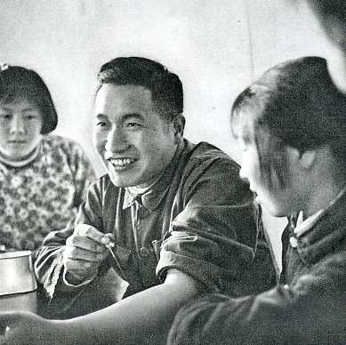 乐园公社合作医疗创办人之一“赤脚医生”覃祥官和生产队“赤脚医生”交流针灸技术。