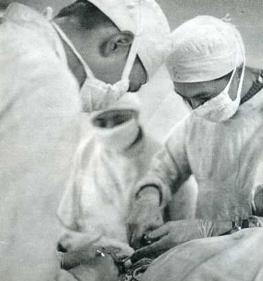 公社医务人员、“赤脚医生”为社员做下腹部手术。