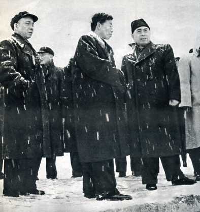 一九五八年初,敬爱的周恩来总理冒雪视察荆江大堤。