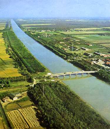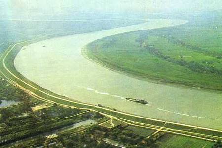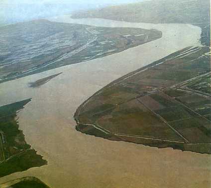 下荆江中洲子裁弯工程,图片左边的两条河道,是旧河湾上,下湾口,中间是裁弯后的新河道。