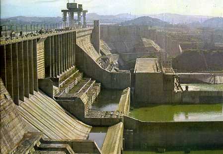 引汉总干渠可从丹江口水库引水五百秒立米。它将使河南西南部广大的干旱地区,逐步得到灌溉。图为引汉总干渠的渠首工程。