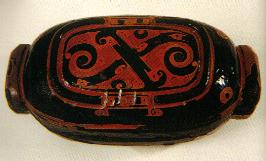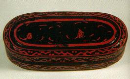 (秦)彩绘波折纹椭圆形漆奁。云梦县睡虎地34号秦墓出土。