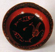 (秦)彩绘鱼鹭纹漆盂。云梦县睡虎地11号秦墓出土。
