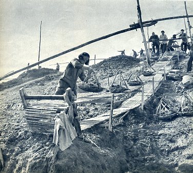 青年突击队队长刘朝绪等制造的卷廉式运土机,工效比人挑高出12倍。