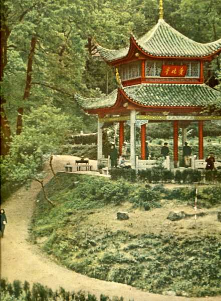 湖南省长沙市的市民和学生们,在风景秀丽的岳麓山“爱晚亭”游玩。这个亭是毛泽东主席青年时代和革命烈士蔡和森同志等经常来读书并讨论中国革命问题的地方。(1953年)