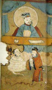 牌位·戴枷亡者。湘中地区流传。图中亡者戴枷,跪于地上,判官正在宣读有关他的文牒。阎王端坐案前,正欲开言问罪。