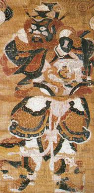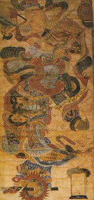功德画·王将军。湘西部地区流传。王将军又称王天君、王元帅,黑脸、红须红发,脚踏风火轮,手执金鞭。上方有护法者,与王将军连成一体,显出护法元帅的威武和力量。