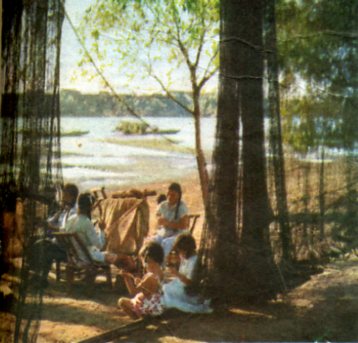 洞庭湖位于湖南和湖北两省之间,面积一万三千八百多平方公里,是长江的天然蓄水库,是我国最大的淡水湖。湖里水产丰富,湖滨盛产大米和棉花,是个鱼米之乡。其它特产象白莲、银鱼和君山茶,也是畅销国内外的。