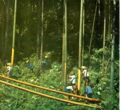 湖南湘西林区试用架空竹条运材成功,效率比人力搬运提高25倍。这种竹条可以载重800公斤,成本只及架空钢索的五十六分之一,而且可以就地取材,架设简便,操作也很安全。(1958年)