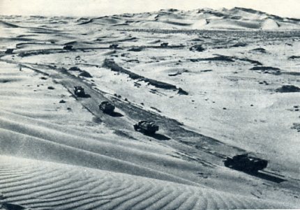贺兰山西部的阿拉善草原,境内七万四千平方公里土地面积,大沙漠占了40%。解放前,没有一条通牧区的公路,没有什么建设。现在,这里出现了三千多眼水井和许多小型水库,十九个公社有半数以上通了汽车,腾格里、乌兰布和沙漠的人民公社通了电话,电报。这是横穿乌兰布和沙漠的一条公路。(1963年)