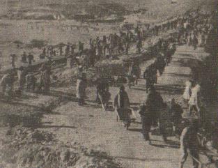 包头市正在大搞水利运动,图为紧张施工的小川口水源工地。(1959年)