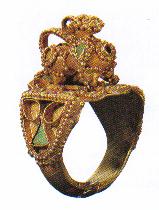 (北魏)鲜卑,嵌松石立羊形金戒指。美岱村出土。