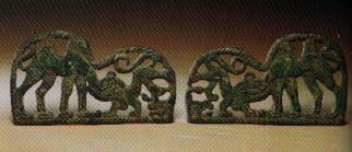(西汉)驼虎咬斗纹铜牌 长12.5厘米。
