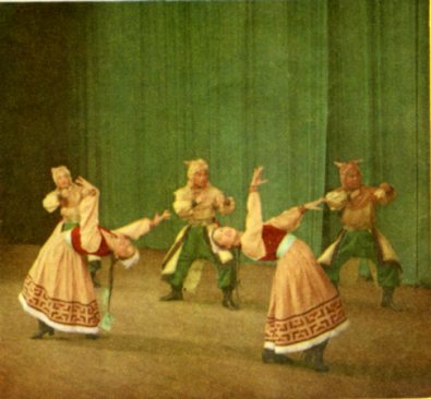 内蒙古歌舞剧团在十年前成立的时候,只有20多人,现在已发展成近200人的队伍。歌舞团的节目大都是团员自己创作的。他们每年有大部分时间在各牧区演出,对草原牧民生活十分熟悉,因而他们创作的节目具有鲜明的民族特色和浓厚的生活气息。有几个节目曾在国外演出,其中“鄂尔多斯舞”还在1955年华沙世界青年联欢节的演出中获得一等奖。