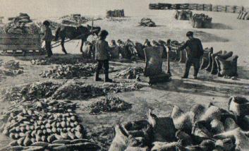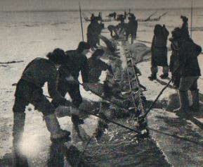 达赉湖(又称呼伦湖),是内蒙古著名的鱼库之一,盛产鲤鱼、狗鱼、白鱼等十多种鲜鱼,年产量达一万吨。每年冬季,达赉湖渔场工人,冒着零下三、四十度的严寒,活跃在冰层上,进行破冰捕鱼。图为捕鱼队坐着爬犁向捕鱼区出发。(1964年)