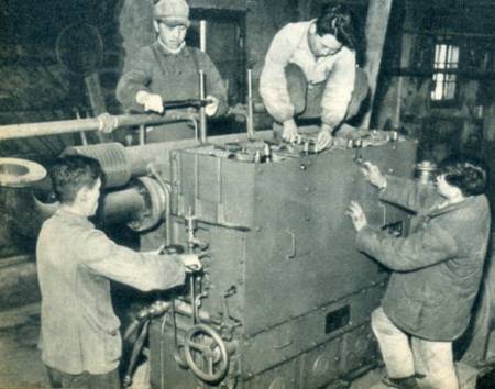 图里河越来越繁荣,发电厂原来的电力感到不足了。现在,工人们正在安装一部新的发电机。