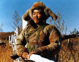 狩猎途中的鄂伦春族男子。鄂伦春族男子穿大襟长袍,长袍下摆有前后左右四个开衩,穿着时紧系麋皮带,下着皮裤皮靴,头戴皮帽。这种装束非常适合于骑马奔跃的狩猎生活。