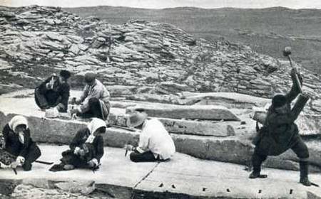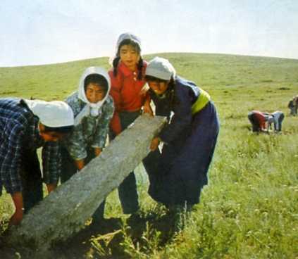 巴音塔拉公社哈尼乌拉大队的牧民,为了建设草原,开山采石。