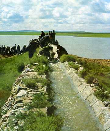 红旗公社哈沙图大队修筑的引湖水上山程。