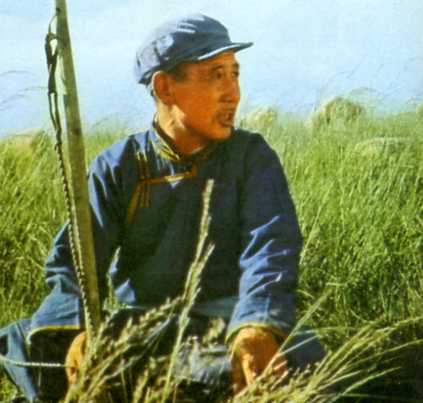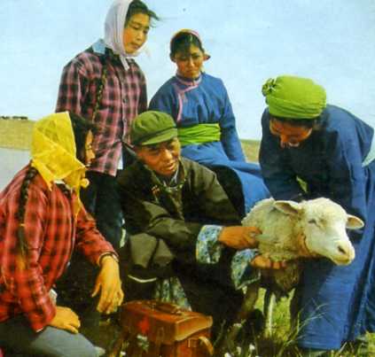 赤脚兽医劳布僧巴拉吉尔精心防治牧畜疾病,使呼贝尔大队的改良细毛羊成活率大大提高。这是他在向青年牧民传授技术。