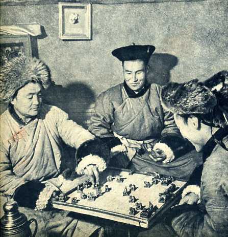 敖斯热(左第一人)和朋友们在蒙古包里下棋。