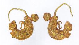辽代(契丹) 摩羯形金耳坠。摩羯原是西方文化的产物,后传入印度,又随佛教传入中国。该耳坠反映了契丹吸收外域文化的结果。