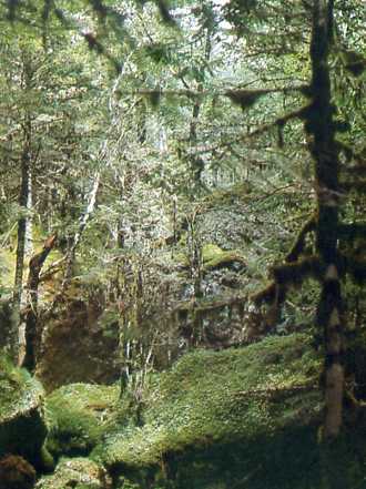 在混交林带,由于林内郁闭阴暗,所以林下灌木和草本植物都不发达,而喜阴湿的苔藓植物特别发育,形成十厘米以上的藓褥。这里被人们称为苔藓世界。
