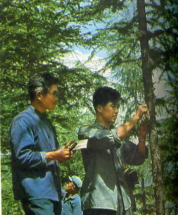 利用赤眼蜂来消灭毛虫,科技人员正松林中观察试验效果。