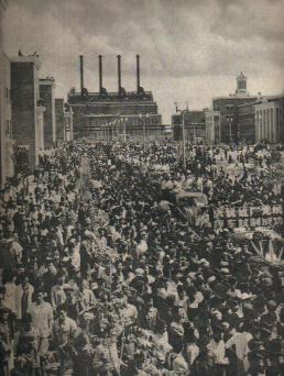 1956年7月14日,长春第一汽车制造厂全体职工欢庆该厂建成和试制成功第一批解放牌载重汽车。图是该厂的先进生产者、职工代表和厂的领导,乘着崭新的汽车向吉林省和长春市党政领导机关报喜。当长长的汽车行列开出该厂时,全体职工夹道欢呼。