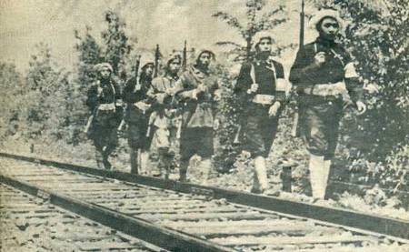 吉林省蛟河县第二区黄松甸村民兵在附近的铁路上巡查,他们担负保护铁路、公路、仓库等国家建设和财富的任务。