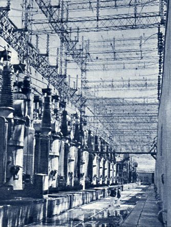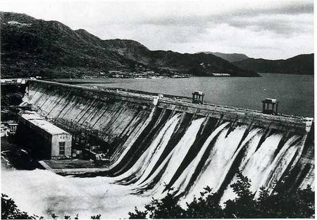 中国的水电建设在第一个五年计划期间有了很大发展。图为扩建后的吉林省丰满水电站。(1955年)