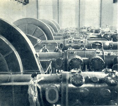 吉林省的丰满水站电,在第一个五年计划期间(1953-1957),对日伪遗留下来的面孔千疮的拦洪大坝进行了加固、加高,并且建成了完整的防水幕和排水系统,安装了11座溢流闸门。它的8台自动化机组现在已全部建成,发电量比解放前增长13倍。(1959年)
