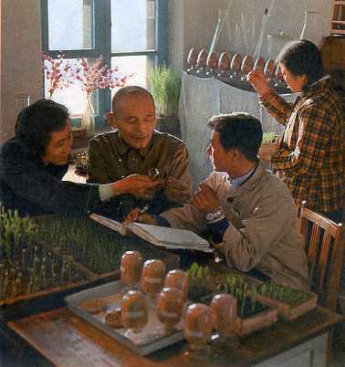 每个公社和大队都建立了科学试验小组。这是永吉县阿拉底大队的社员试验种子的发芽率,为春播做准备。