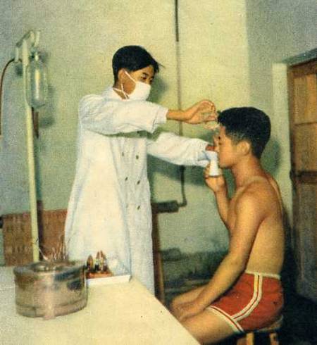 一天的工作结束后,工人们洗完了澡,正由医生洗涤眼睛。