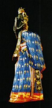 朝鲜族传统服饰。此为红园衫,是太子妃在正式场合的大礼服,上衣缀织金圆形五爪龙补,其它纹饰为云纹、凤纹、花草纹,腰系织金红色腰带,装束雍容华贵。