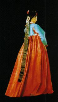 朝鲜族传统服饰。长裙和短衣是朝鲜族女子的民族装,不论地位高低、年老年幼,都以此为基本服装,从三国时代至今,一直没有改变。地位的高低,可能在质料、颜色、佩饰和裙子的宽窄等方面稍有不同,但款式和制作没有差异。