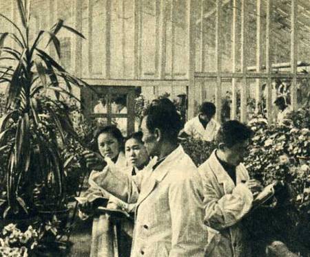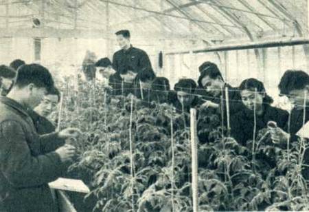 朝鲜族人民的高等学府—延边大学,现有学生1000多人。图为延边大学农业专修班的同学们,在温室里研究肥料对各种植物生长的影响。