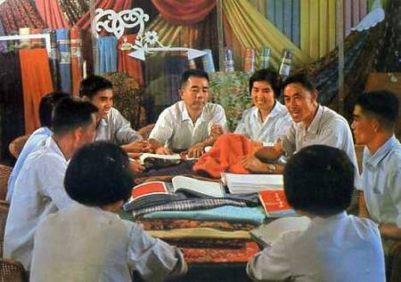 在中共常州市委的领导下,全市组成了八条生产协作线,充分发挥了社会主义企业的积极性。图为灯蕊绒生产协作线的有关单位的代表,正在研究进一步提高产品的质量。