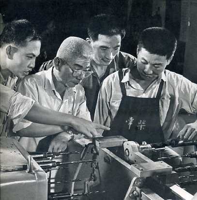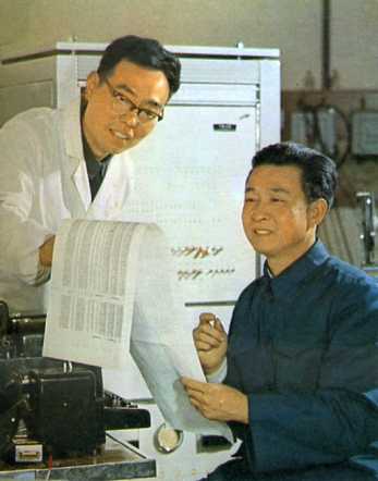 电讯电机厂工程师陈理璧(右一)主持设计、研制成了步进电机。这是他在研究有关数据。