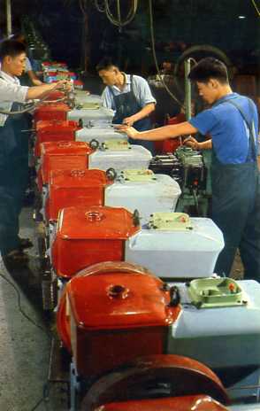 常州柴油机厂的工人正在生产安装小型柴油机。这种柴油机很受农民的欢迎。